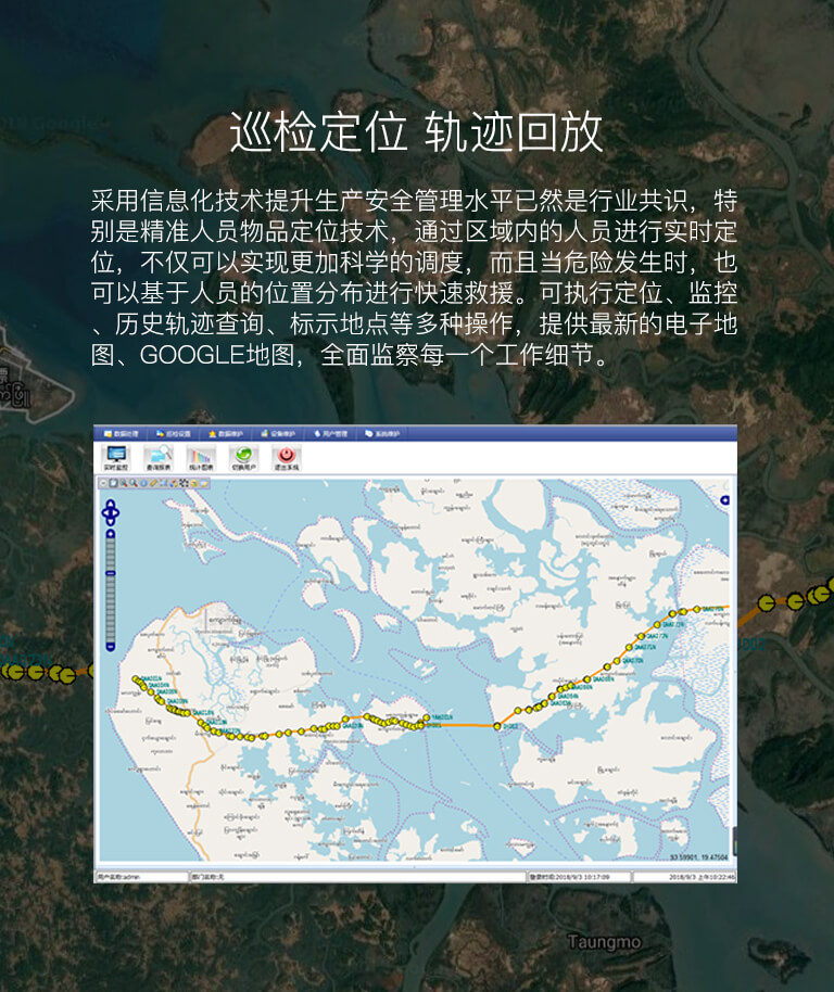 巡檢器通過北斗定位芯片、會對數據完成感知、存儲和傳輸,并在系統后臺軟件上實時顯示人員定向! 管理者通過PC端或移動客戶端輕松實現管理,并消除隱患,保障安全。 產品工業級防爆IP67,無漏檢、免布點、定位精度<5米,定位軌跡回放、4G網絡實時傳輸。 整合管理功能:人員定位、巡檢、考勤、軌跡回放、監督管理等。