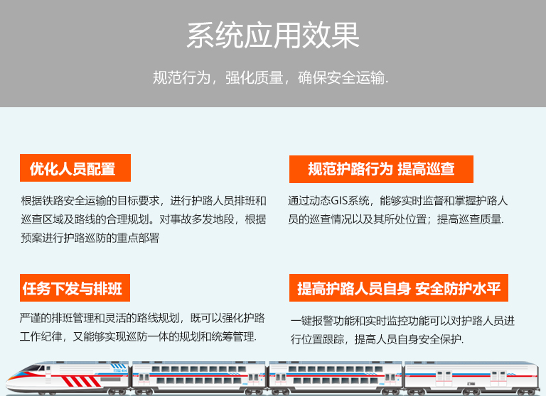 通過《鐵路護路巡檢管理系統(tǒng)》,規(guī)范專業(yè)護路隊伍執(zhí)勤行為,強化護路巡查質(zhì)量,實現(xiàn)鐵路護路防控工作科學(xué)